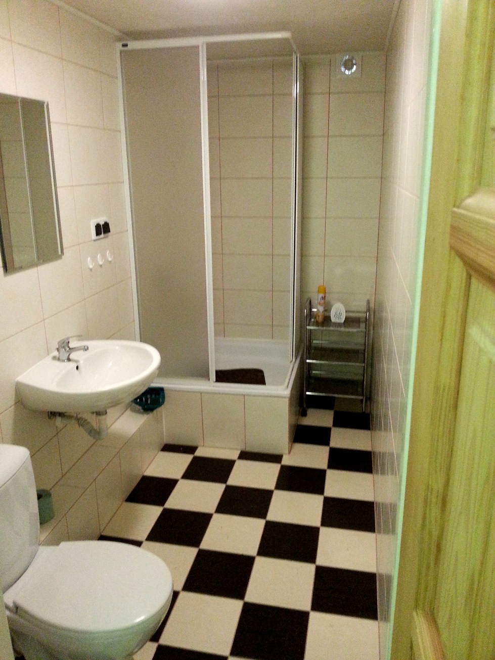 pokój z łazienką, przestronny i dobrze oświetlony, w pokoju 4 łóżka, radio i telewizor.